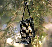 Suet bird feeders are mesh feeders that hold the high energy, high calorie suet bird feed. They look like small wire baskets that are specifically designed to hold a suet cake. A common size is 4 inches by 4 inches but other sizes are available. They are great for attracting woodpeckers but cardinals, bluebirds, and wrens love them too.