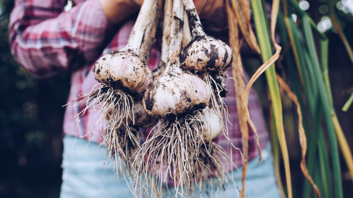 Harvest garlic when most of the leaves have turned yellow and brown, usually from mid-July to early August, depending on your climate. Carefully dig up the bulbs to avoid bruising. If left in the ground too long, the bulbs may split and won’t store well. Allow the garlic to dry for 2-3 weeks in a shady area with good airflow. If rain is forecasted, bring the garlic inside. Once the roots are dry and brittle, rub them off along with any loose dirt.