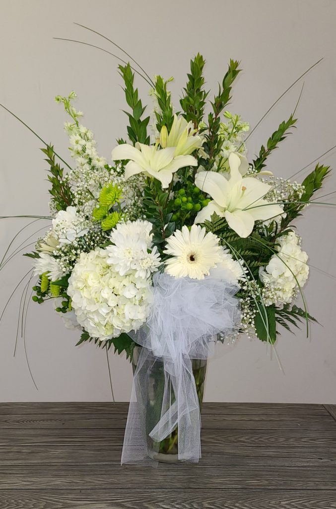 Our Simply Elegant bouquet is popular for expressing gratitude and admiration for your mother. This arrangement features white hydrangea, gerbera, lilies, chrysanthemums, daisies, and baby’s breath, in a large glass vase with leather leaf and eucalyptus accents. A sheer white bow adds the finishing touch.