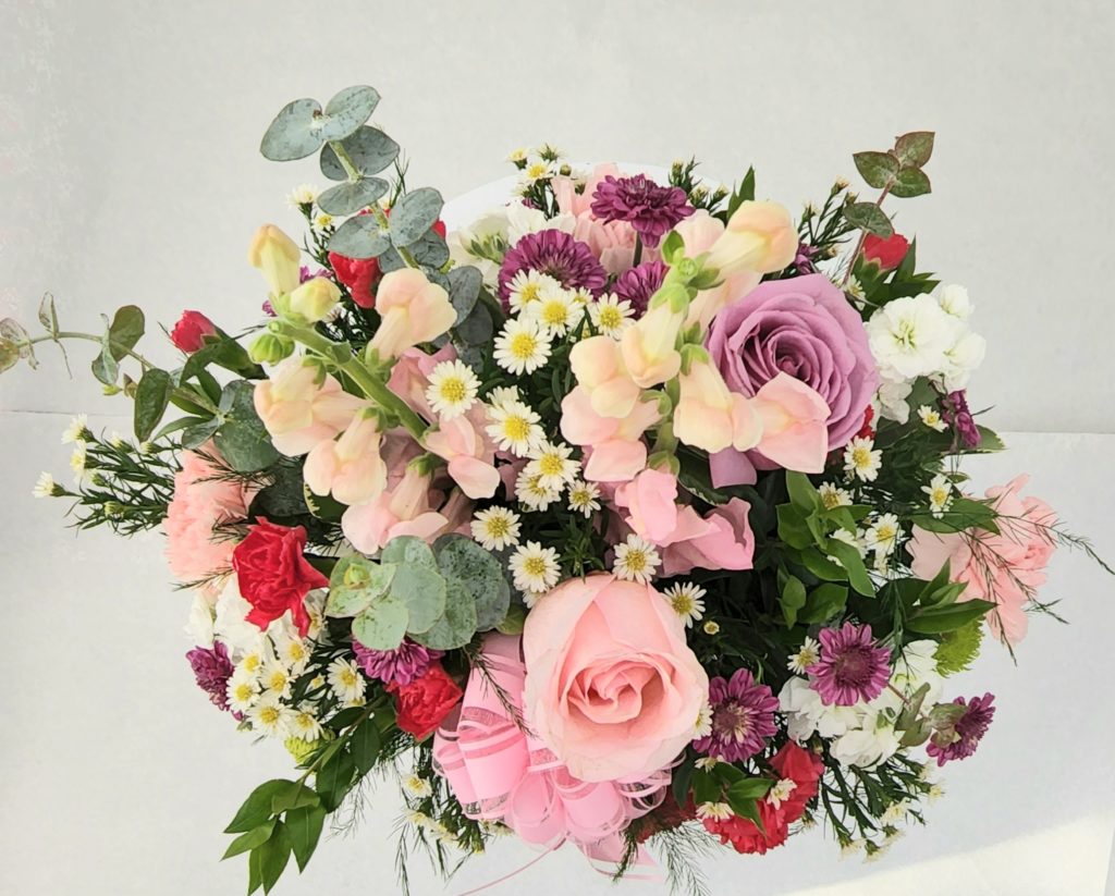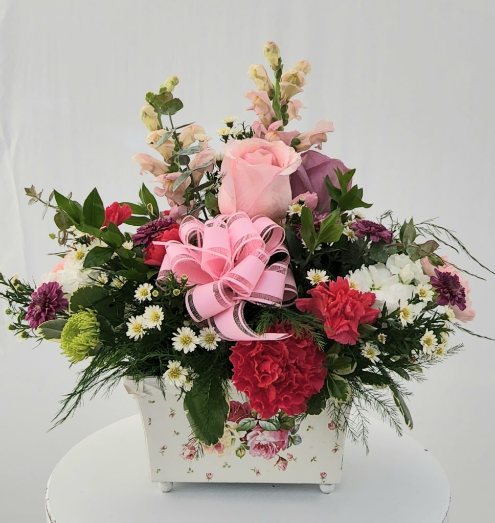 For great Mother’s Day-specific floral options, check out our Amazing Mom bouquet. The Amazing Mom bouquet is a lovely spring mix of roses, chrysanthemums, carnations, snapdragons, feverfew, eucalyptus, and more. Adorned with a pink decorative bow, this arrangement is placed in a square rose-printed stand that makes for a stunning display.