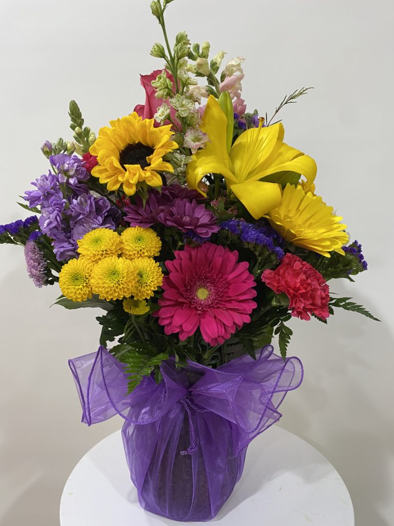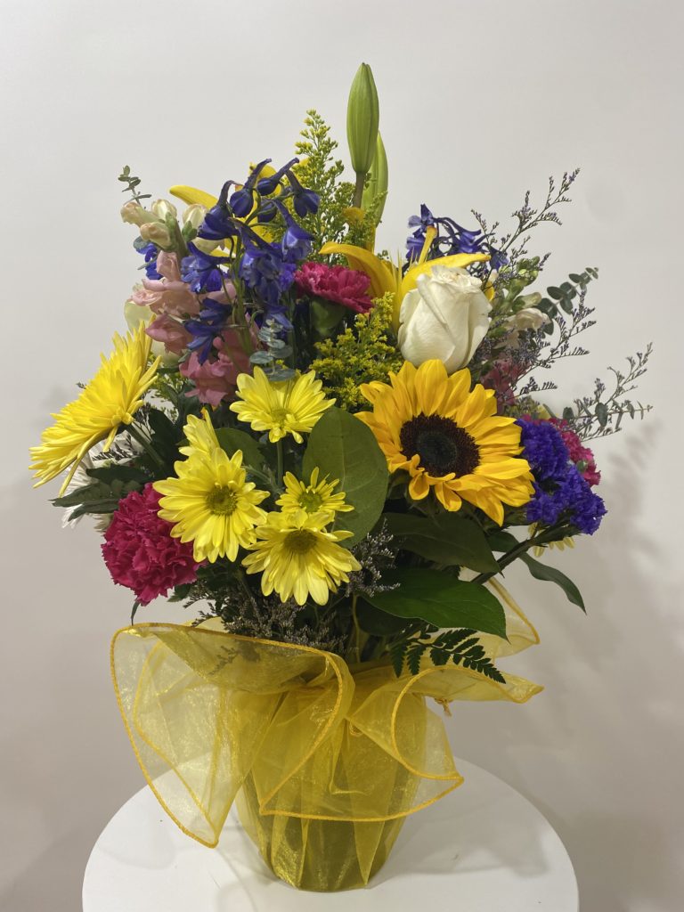 Our fresh floral arrangement #1 is another spring bouquet containing hydrangea, lilies, chrysanthemums, sunflowers, carnations, delphinium, and thistle. It is a large bouquet measuring 24″ high by 20″ wide and comes in a glass vase with a bow wrapped in clear cellophane.
