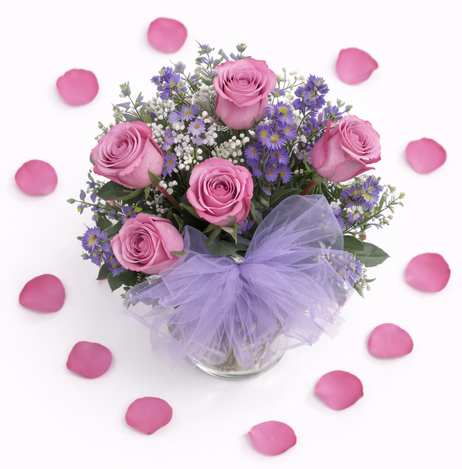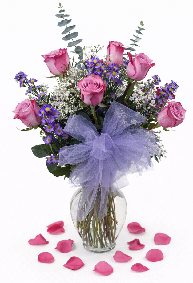 This beautiful bouquet contains 1 dozen Lavender Roses. This arrangement comes in a beautiful glass vase with a bow and wrapped to perfection in a clear cellophane. It stands 25 inches tall by 20 inches wide.