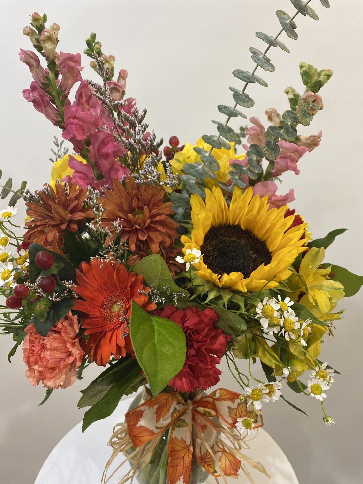 This autumn crisp bouquet contains a mixture of Sunflowers, Carnations, Eucalyptus, Daisies, Flowering Stock and more. This arrangement comes in a beautiful glass vase with a fall bow.