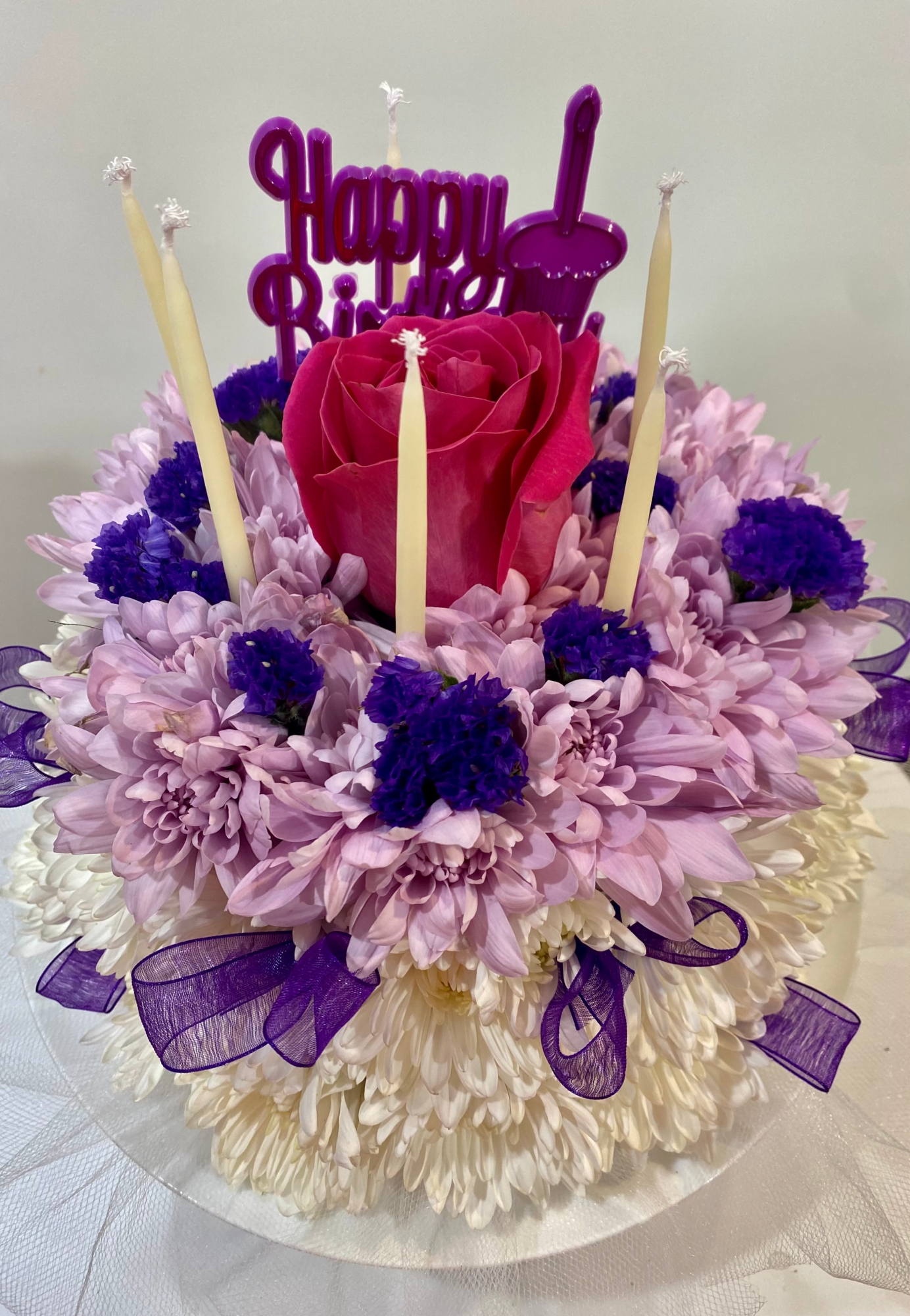 This joyful birthday bouquet contains a mixture roses and daisies shaped like a cake adorned with candles a ribbon and a happy birthday cake topper.