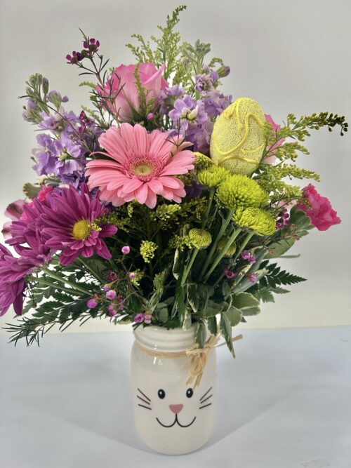 The Bunny Mason Jar Floral Arrangement is a festive spring flower arrangement in an adorable keepsake Bunny Mason Jar. This arrangement is a combination of roses, daisies, carnations, greenery, and more.