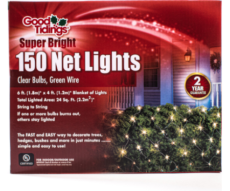 Good Tidings Net Clear Light Set is a versatile shrub light designed for easy-to-use decoration, setup in minutes. Great for bushes, trees or windows. Uniform bulb pattern. UL Listed. End-to-end plugs.