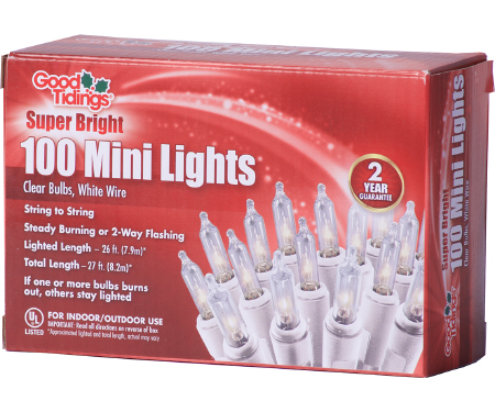 Super Bright features 2.5 volt Super Bright bulbs, end-to-end plugs and 3″ bulb spacing. Super Bright lights are great for both your indoor and outdoor decorating needs. Super Bright lights carry a two-year guarantee. Mini light set with 100 clear bulbs and green wire. 27′ L.