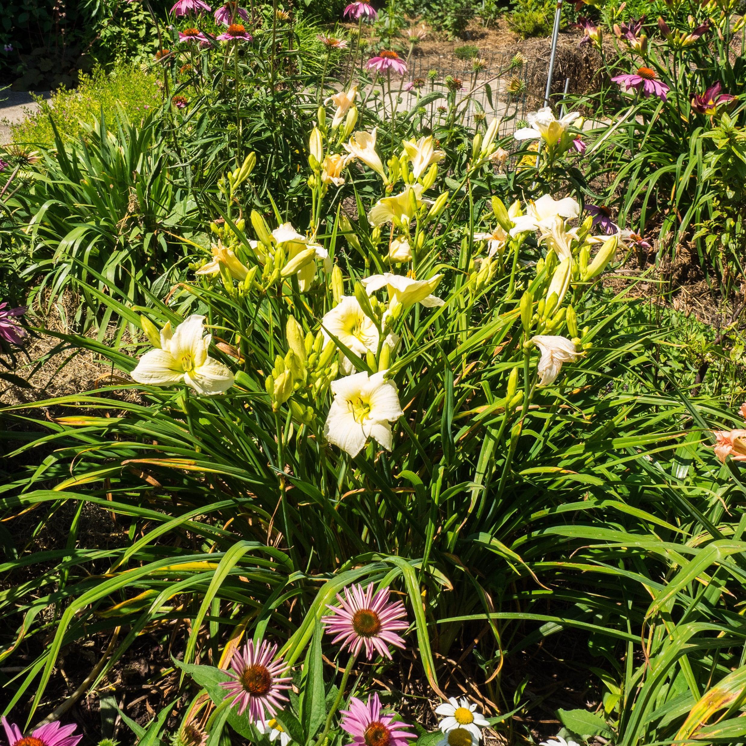 Joan Senior Daylily is a reblooming evergreen perennial with strap-like deep green foliage that is notable for its large blooms. The fragrant near white flowers have a yellow watermark and green eye with lightly ruffled edges. The continuous blooms begin in summer and last for two months, with each flower lasting a day attracting butterflies and pollinators. Grows best in deep rich well-drained soils. Drought, salt, and pollution tolerant once established.
