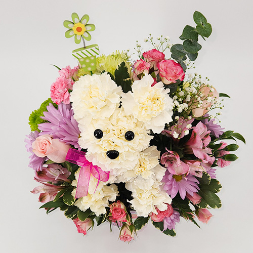 Tell Mom you lover her “beary” much by sending her the Mother’s Day Teddy Graham floral arrangement. This lovely arrangement is a mixture of carnations, roses, mums, hydrangea, tiger lilies, and mini carnations all placed in a floral printed pot. The arrangement stands 18″ high and is 14″ wide.