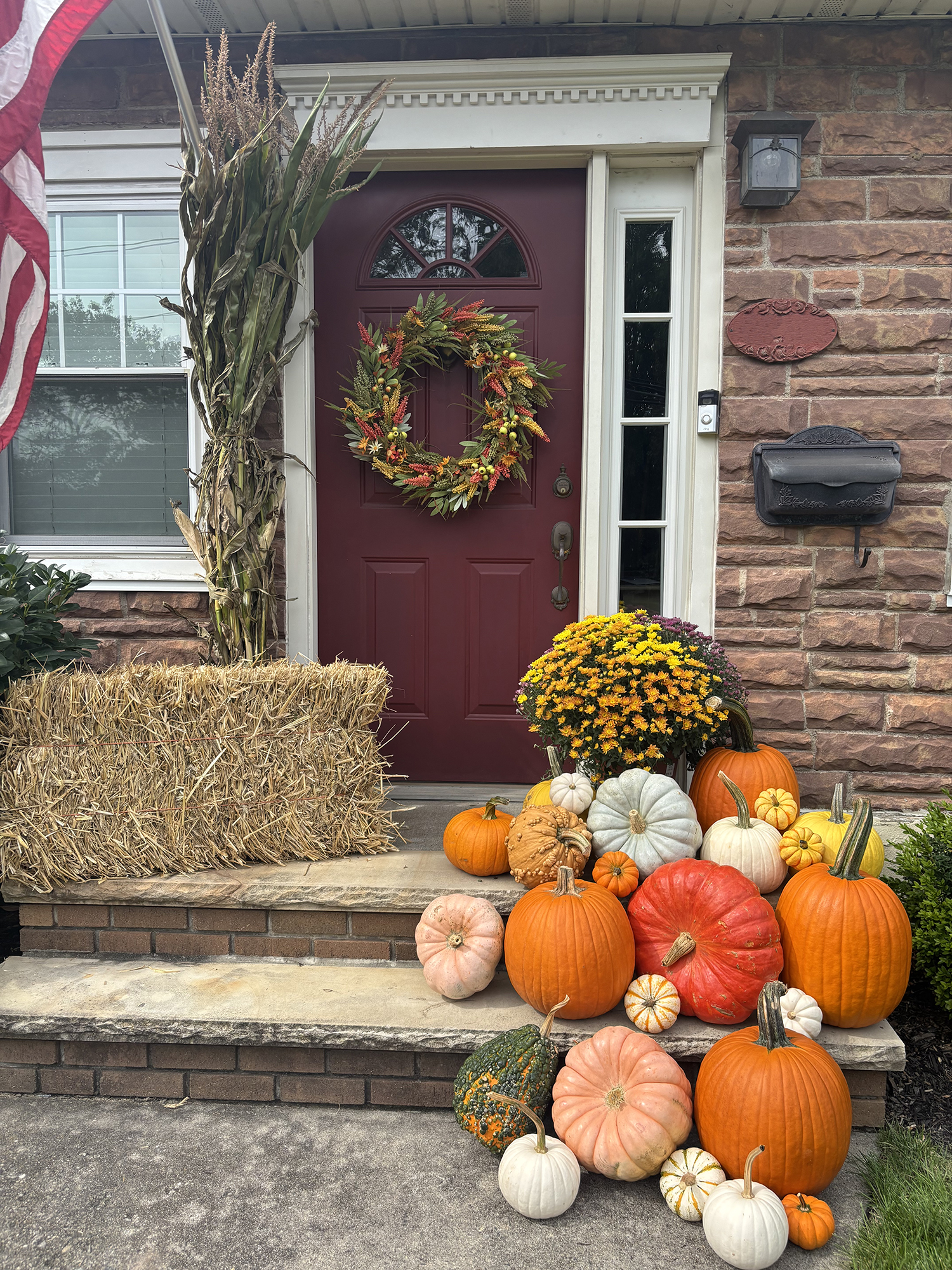 Add rustic autumn charm to your porch, yard, or outdoor displays with a classic hay bale, corn stalk or mums perfect for pairing with pumpkins.