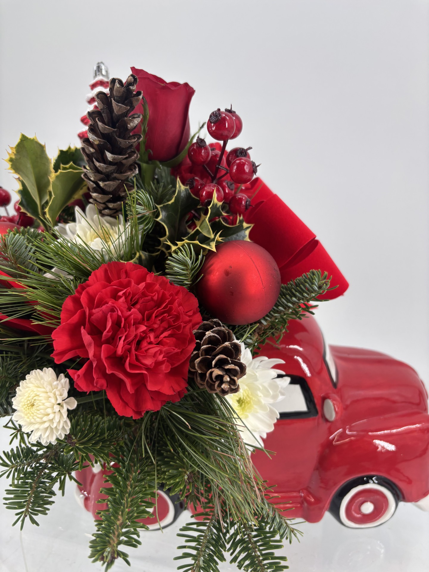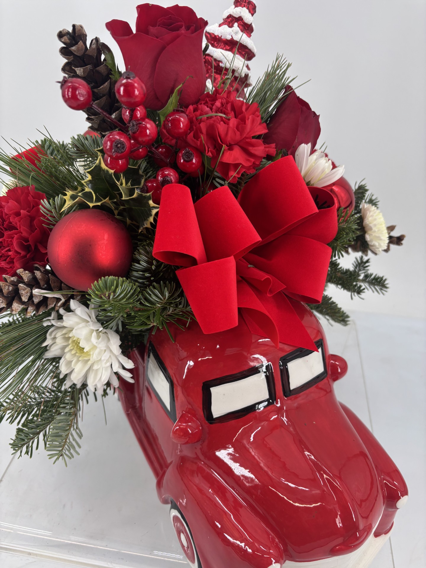 Beautifully arranged Christmas greens, roses and carnations in keepsake Ceramic Red Pick up truck.