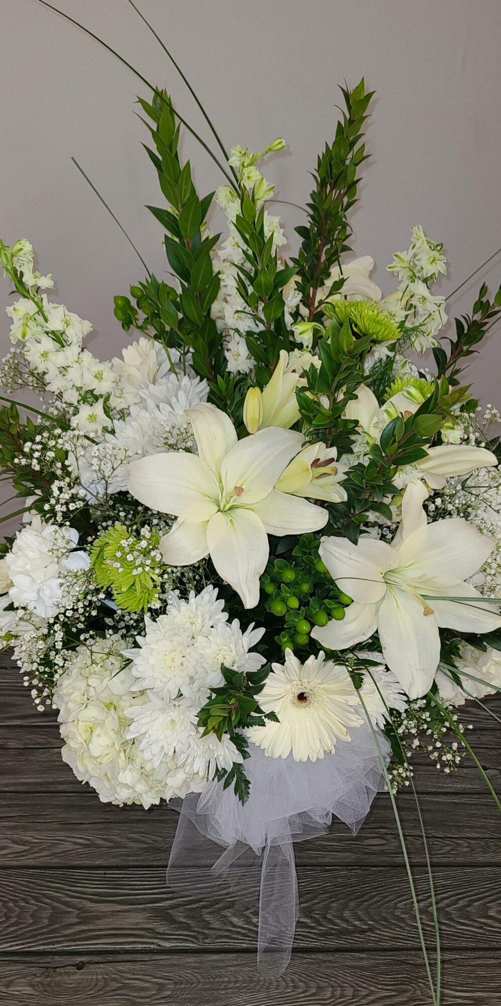 This floral arrangement is just Simply Elegant and perfect for every occasion. This is a mixture of white Hydrangea, Gerbera, Lilies, Chrysanthemums, Daisies and Baby’s Breath. We arrange it perfectly in a large glass vase, then add leather leaf and eucalyptus and top it off with a beautiful white sheer bow. Measurements are 33 inches high by 24 inches wide and a 24 inches diameter.