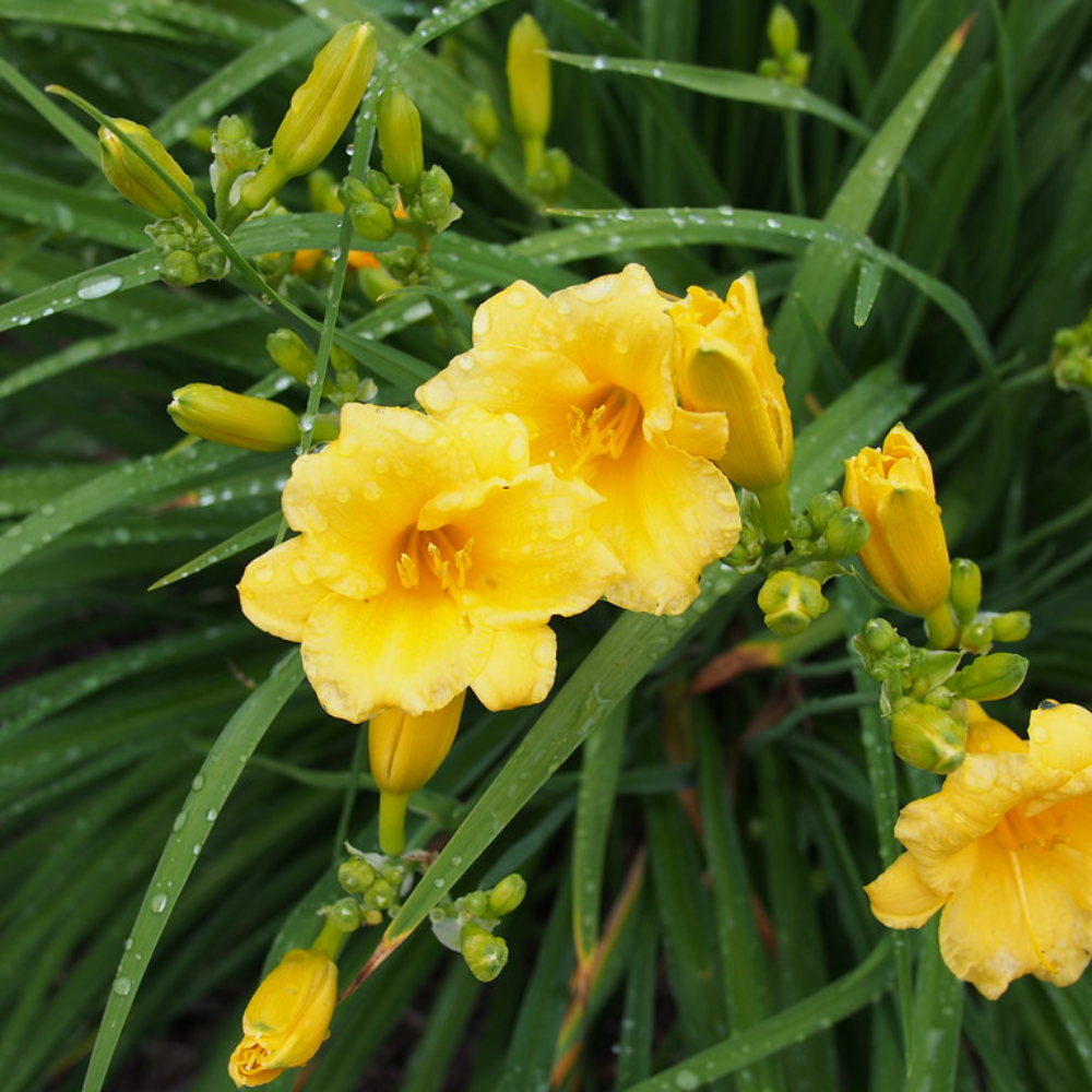 Stella de Oro Daylily is a semi-evergreen perennial with straplike deep green foliage that remains evergreen in milder climates. The miniature ruffled yellow flowers bloom in heavy clusters in summer and can rebloom continuously into fall if deadheaded immediately after flowering. The flowers attract butterflies and pollinators. Best bloom in deep and rich well-drained soils. Drought and salt tolerant once established.