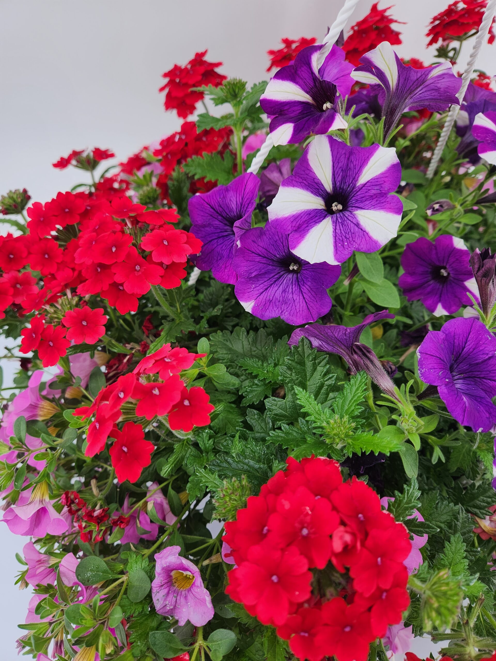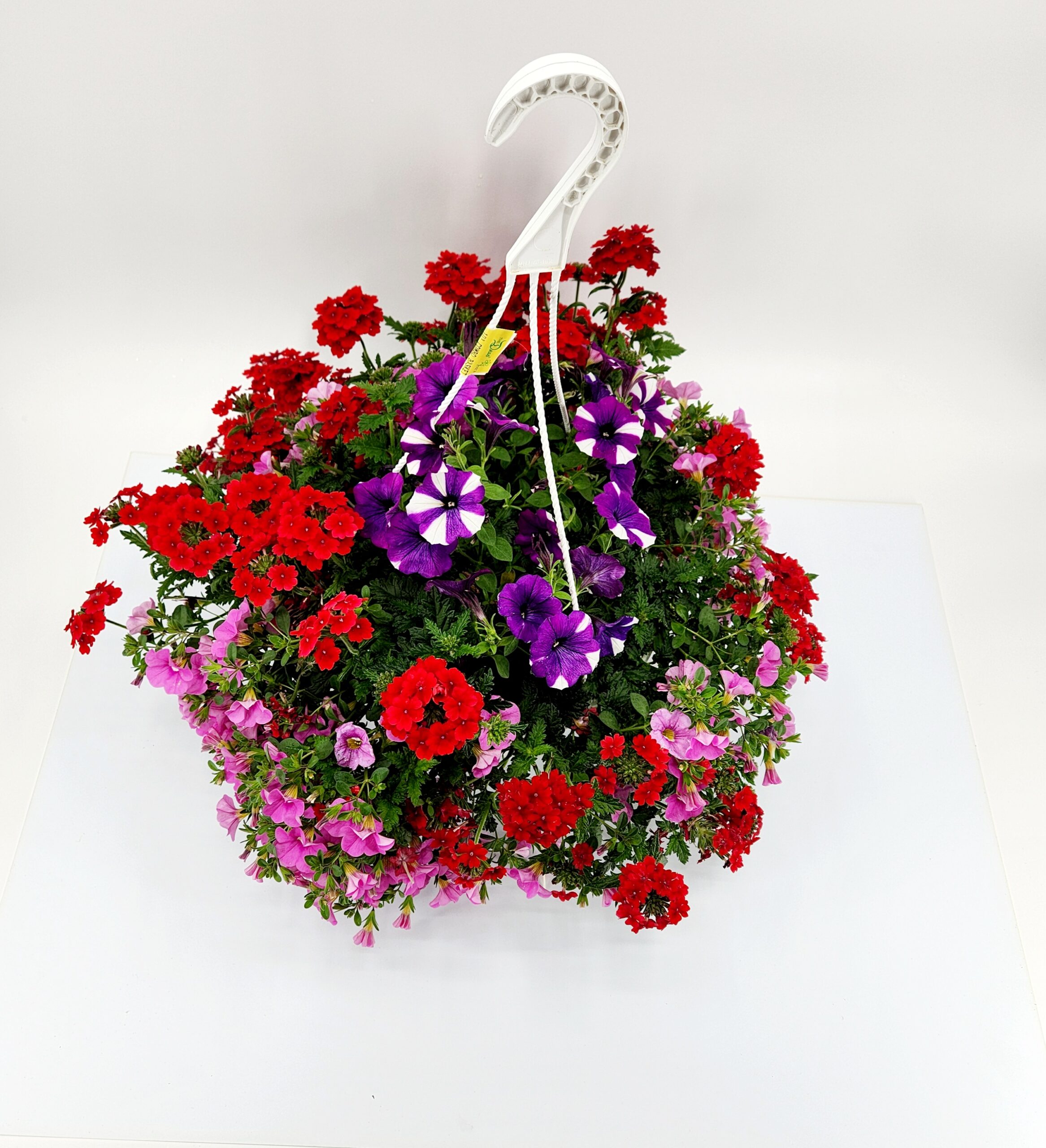 This beautiful 10-inch Combo Hanging Basket is “Deck and Patio Ready” for you to enjoy for the spring and summer. These beautiful colors include a mixture of Sanguna Red Petunias, Callie Yellow Calibrachoa and Purple Verbena. This will do great in a full sun to part sun location in your yard or patio. It flowers all summer. Regular fertilizing and maintenance are recommended. This amazing combo stands approximately 16 inches high and 24 inches wide. It makes a beautiful gift for all who receive it including yourself.
