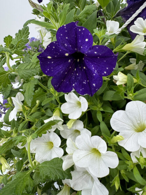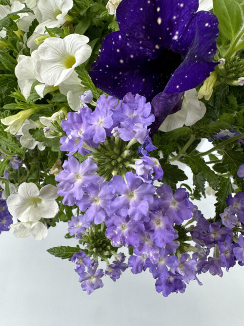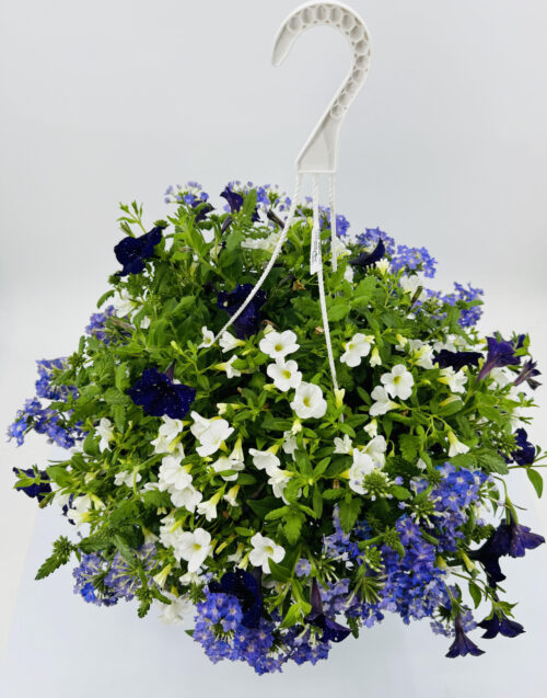 This beautiful 10-inch Combo Hanging Basket is “Deck and Patio Ready” for you to enjoy for the spring and summer. This beautiful hanging basket includes Shortcake Blueberry Petunias and accented with lavender verbena. This will do great in a full sun to part sun location in your yard or patio. It flowers all summer. Regular fertilizing and maintenance are recommended. This amazing combo stands approximately 16 inches high and 22 inches wide. It makes a beautiful gift for all who receive it including yourself.