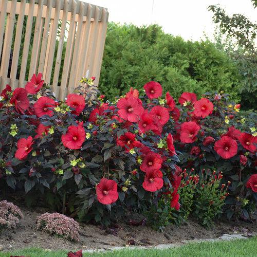 Holy Grail Hibiscus is a vigorous woody perennial with a mounding habit and hardy upright stems and lobed near-black foliage with hairy undersides. The huge, textured dark red flowers bloom throughout summer into fall attracting butterflies. Best bloom in full sun and moist well-drained soils. The Summerific series blooms all long the stems instead of just at the stem ends like most older hibiscus varieties.