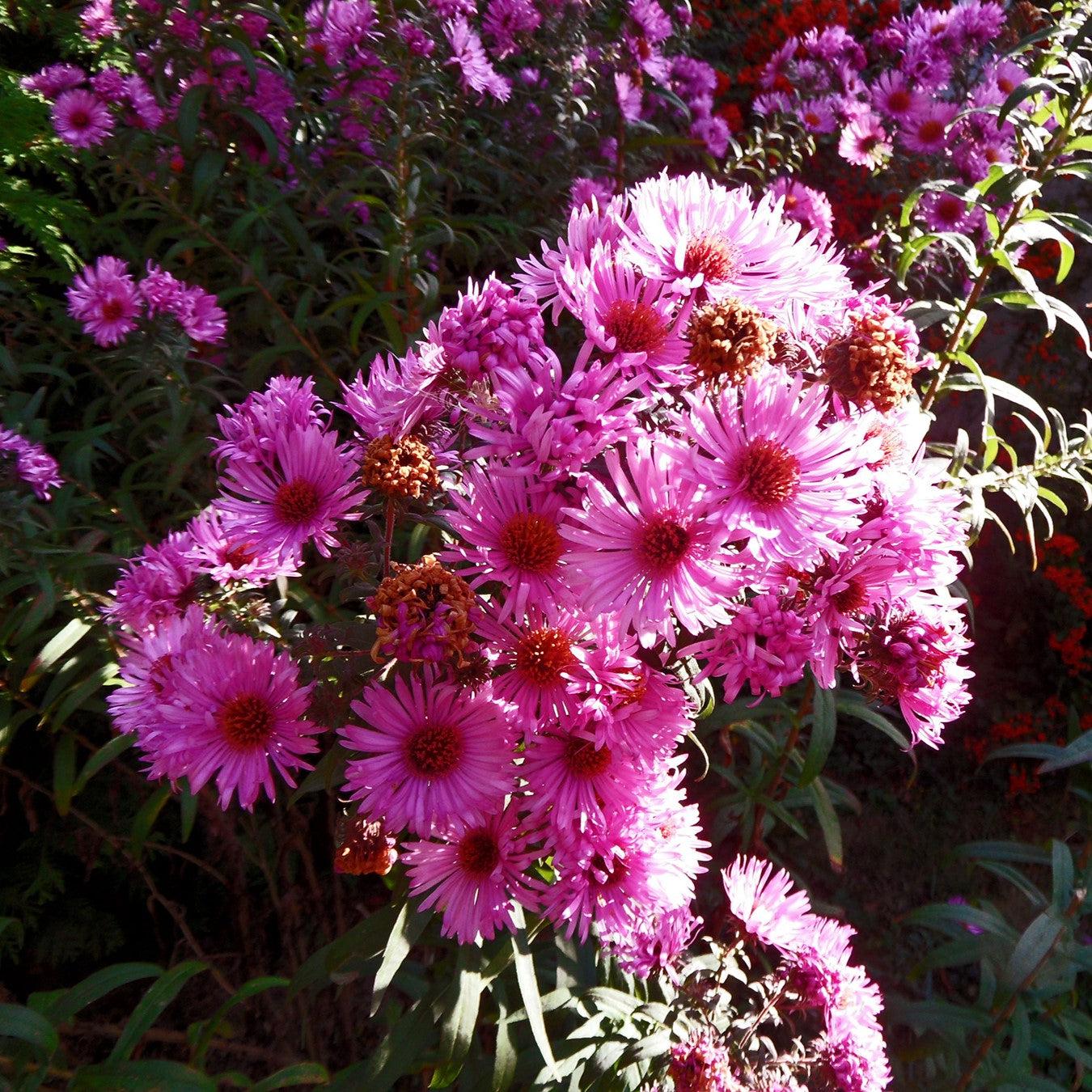 Vibrant Dome New England Aster is a dwarf native perennial with a dense mounded habit and rough, hairy lance-like green leaves. The large, lacy double petaled hot magenta flowers bloom in tight clusters from late summer until the first frost. Its flowers are attractive to butterflies and bees. Grows best in full sun and rich, moist soils. Drought tolerant. Vibrant Dome has excellent powdery mildew resistance.