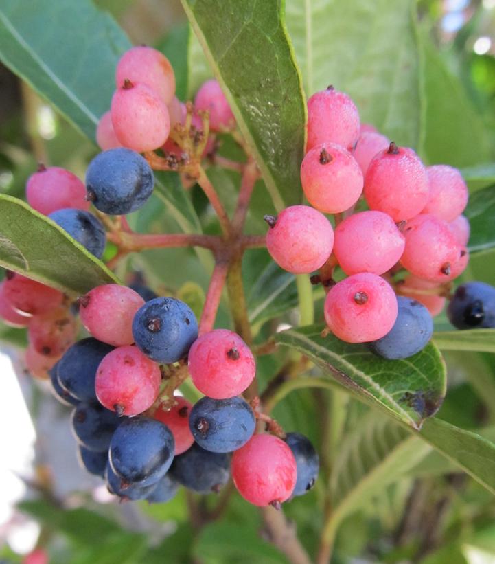 Brandywine Viburnum is a compact, multi-stemmed native deciduous shrub with unusually intensely colored berries and glossy wrinkled dark green leaves that turn dark maroon-red in fall. Flat clusters of fragrant white flowers bloom in late spring and give way to green berries that ripen to vivid pink and blues in fall. Flowers best with full sun and moist, lightly acidic well-drained soils. Drought tolerant once established. Foliage is evergreen in the South but will still earn fall color.